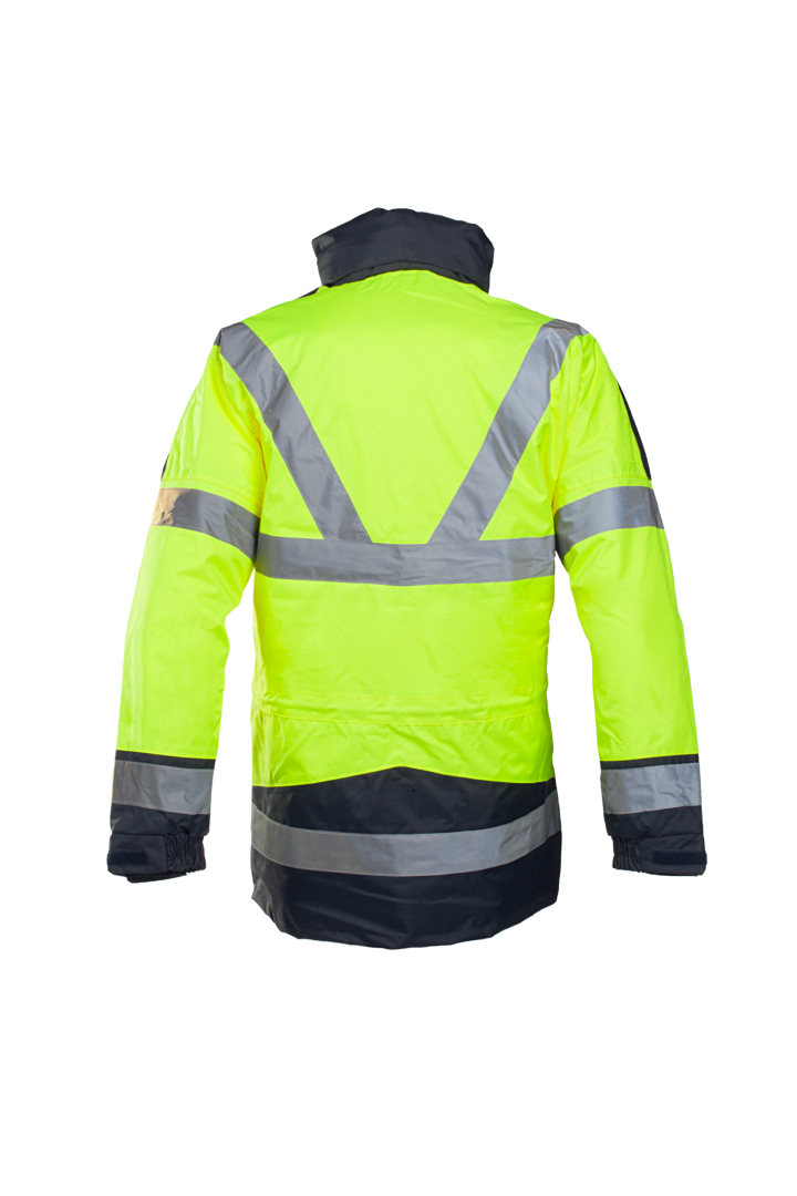 Κατασκευασμένο από Siopor® Ultra ύφασμα (100 % πολυεστέρας με PU επίστρωση), συνδυάζει αδιάβροχη, αντιανεμική και αναπνέουσα προστασία, ενώ η αποσπώμενη εσωτερική επένδυση παρέχει θερμότητα και προσαρμοστικότητα για κάθε εποχή. Το μπουφάν διαθέτει κουκούλα που αποθηκεύεται στον γιακά, πολλαπλές τσέπες, πλεκτές μανσέτες και ανακλαστικές ταινίες υψηλής ορατότητας, προσφέροντας πλήρη επαγγελματική προστασία.